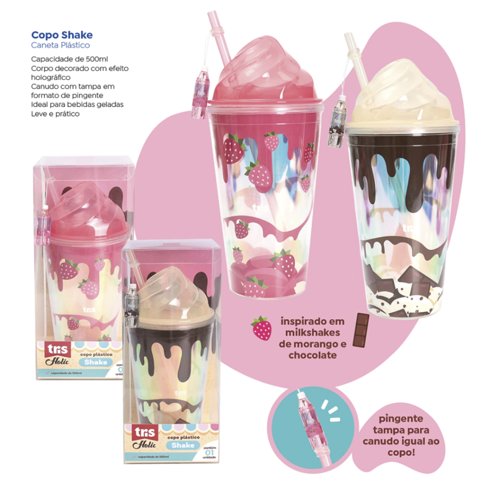 A coleção Docinho traz para as papelarias produtos inspirados nas delíci as do universo da confeitaria! Donuts, balinhas, sorvetes e muito mais! É pura fofura! O copo Shake tem capacidade de 500ml e é inspirado em milkshakes de chocolate e morango! É ideal para bebidas geladas e vem com canudo com pingente tampa, para proteger o canudo!