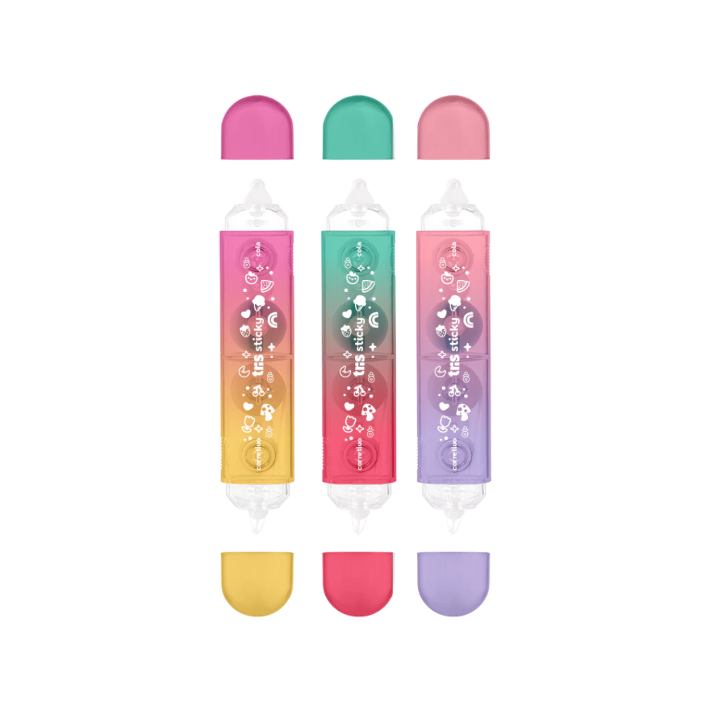 A fita Sticky é 2 em 1: fita corretiva de um lado e cola em fita do outro. É super prático.