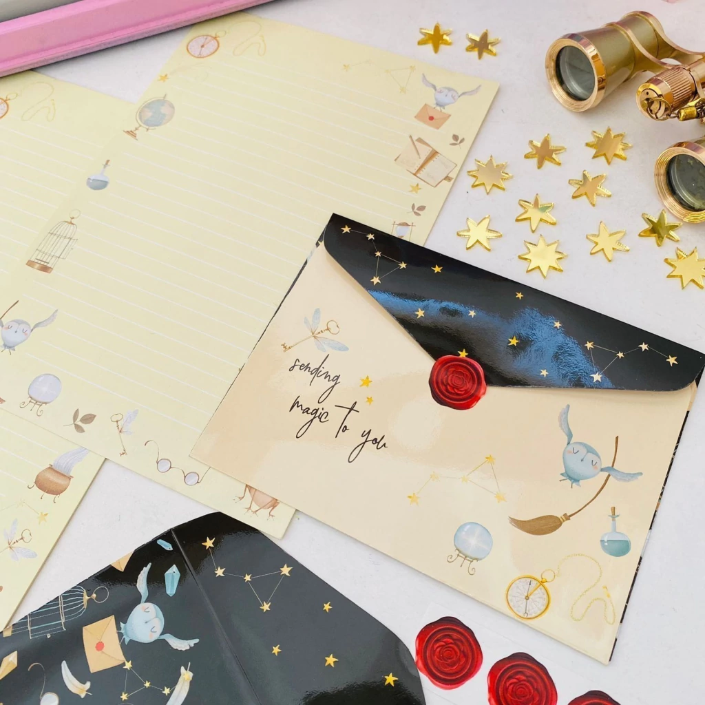 Cada kit contém 4 envelopes, 4 papéis de carta e 4 adesivos para fechamento.
